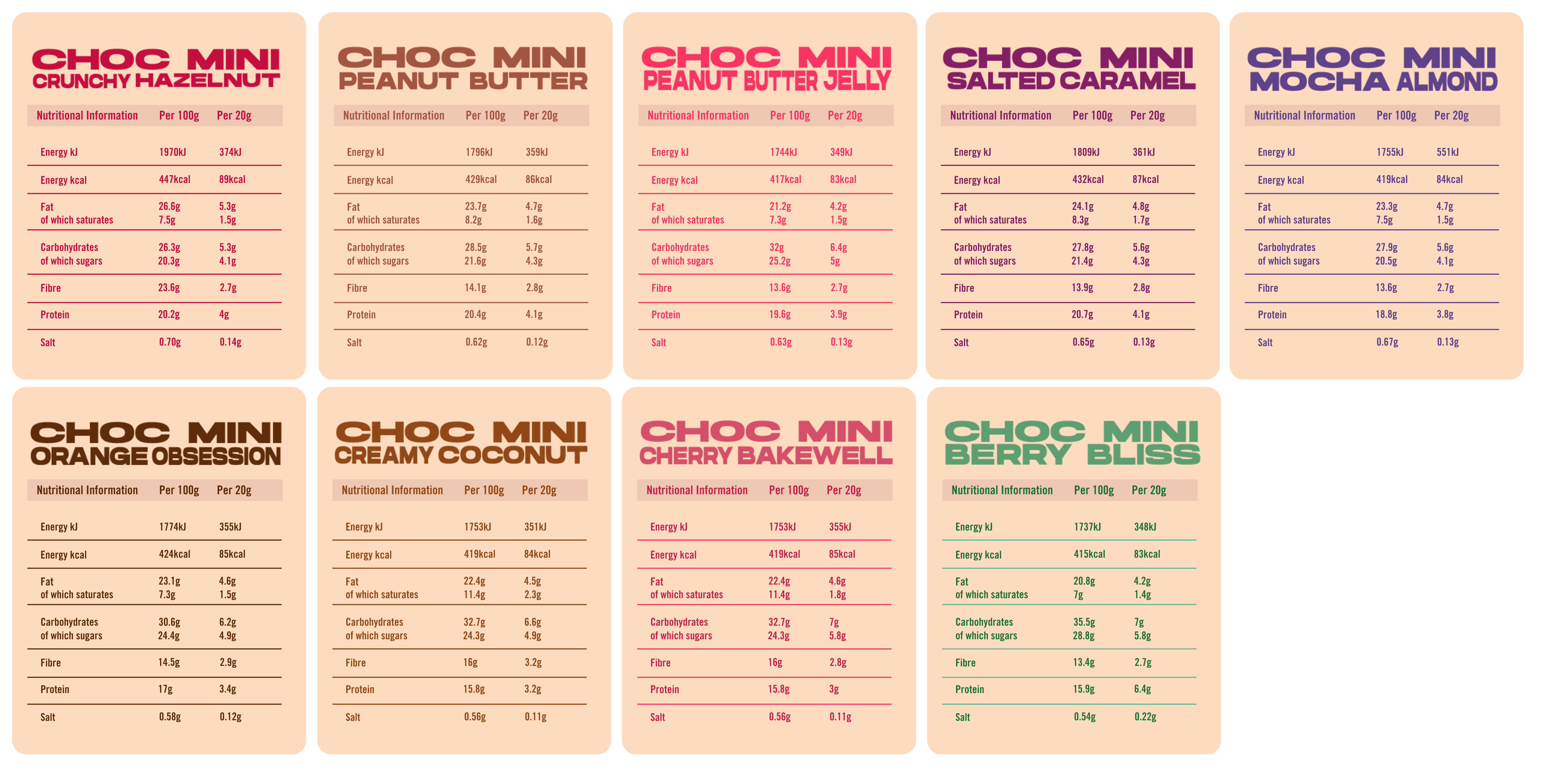 Mocha Almond - CASHEWS (15%), Dates, 74% Organic Dark Chocolate (Cocoa Mass, Organic Cane Sugar, Cocoa Butter, Vanilla Powder), Chicory Fibre, ALMONDS (10%), Pea Protein, Protein Crisp (Pea Protein, Rice Flour), Rice Syrup, Concentrated Grape Juice, Ground Coffee (2%), Coconut Oil, Reduced Fat Cocoa Powder, Rice Protein, Emulsifier: Sunflower Lecithin, Salt, Natural Vanilla Flavour.
