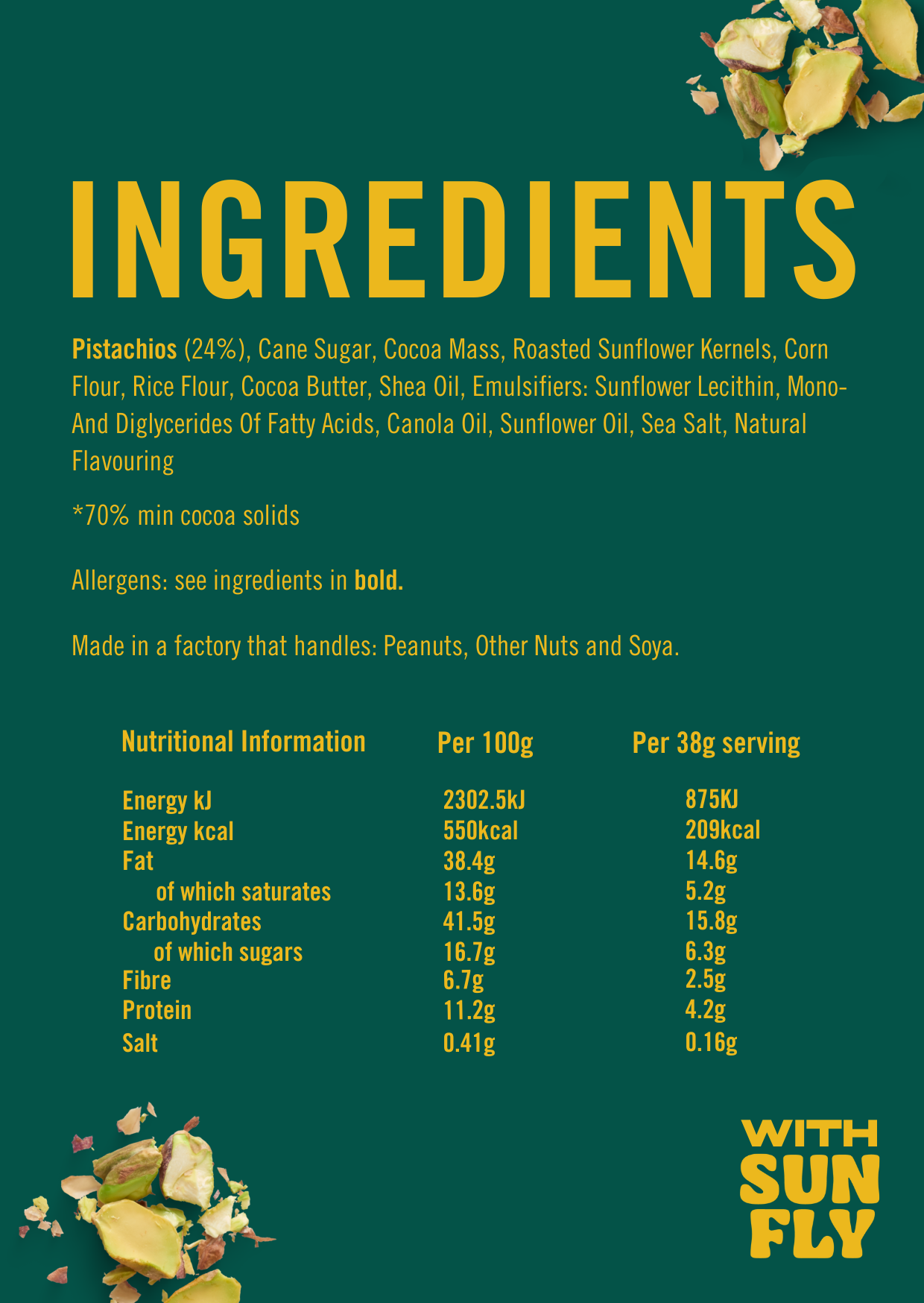 Dark Chocolate (Cocoa Mass, Sugar, Cocoa Butter, Emulsifier (SOYA Lecithin)), Natural Vanilla Flavouring, Chicory Fibre, CASHEWS, Pea Protein Isolate, Dates, Rice Syrup, Concentrated Grape Juice, Coconut Milk Powder (Coconut Milk Powder, Maltodextrin), Chicory Inulin, Glucose Syrup, Reduced Fat Cocoa Powder, Protein Crisp (Pea Protein, Manioc Starch), Natural Flavouring, Salt, Emulsifier: Sunflower Lecithin.