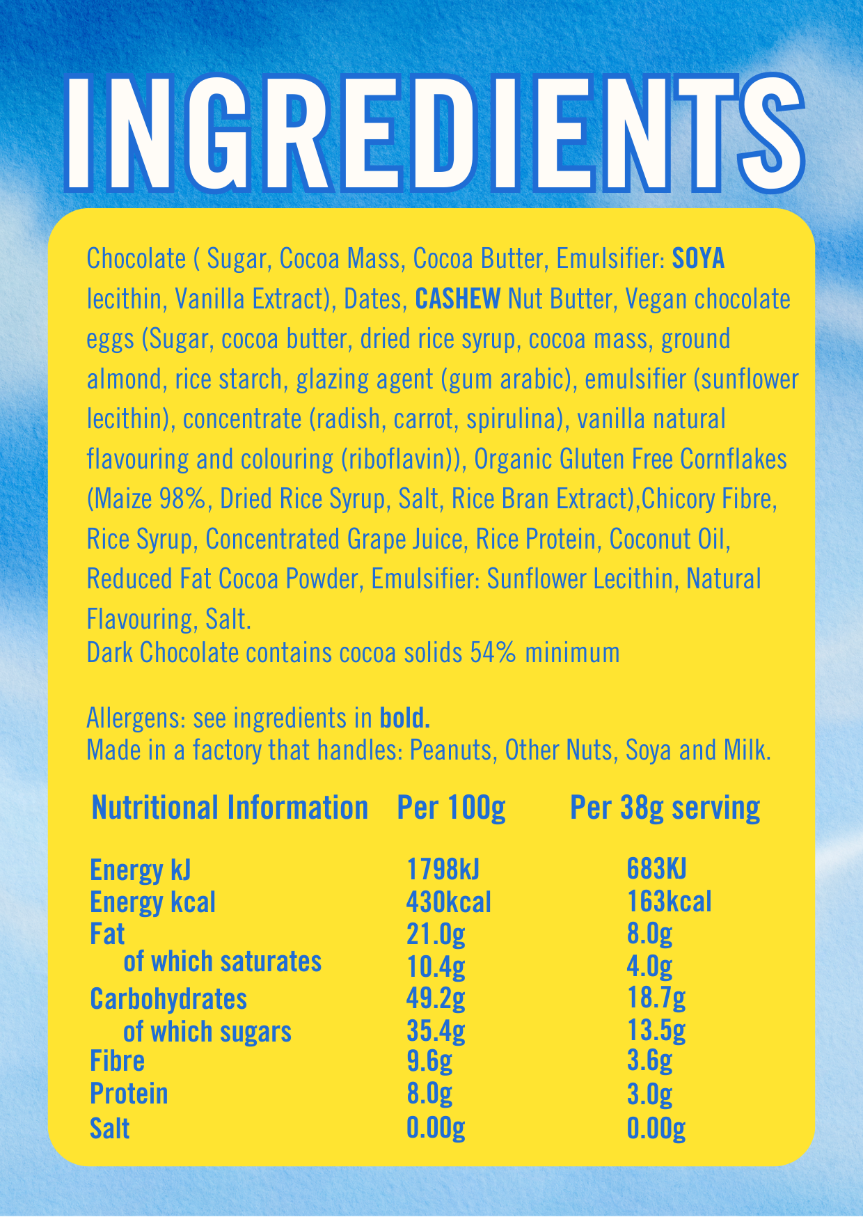 Dark Chocolate (Cocoa Mass, Sugar, Cocoa Butter, Emulsifier (SOYA Lecithin)), Natural Vanilla Flavouring, Chicory Fibre, CASHEWS, Pea Protein Isolate, Dates, Rice Syrup, Concentrated Grape Juice, Coconut Milk Powder (Coconut Milk Powder, Maltodextrin), Chicory Inulin, Glucose Syrup, Reduced Fat Cocoa Powder, Protein Crisp (Pea Protein, Manioc Starch), Natural Flavouring, Salt, Emulsifier: Sunflower Lecithin.