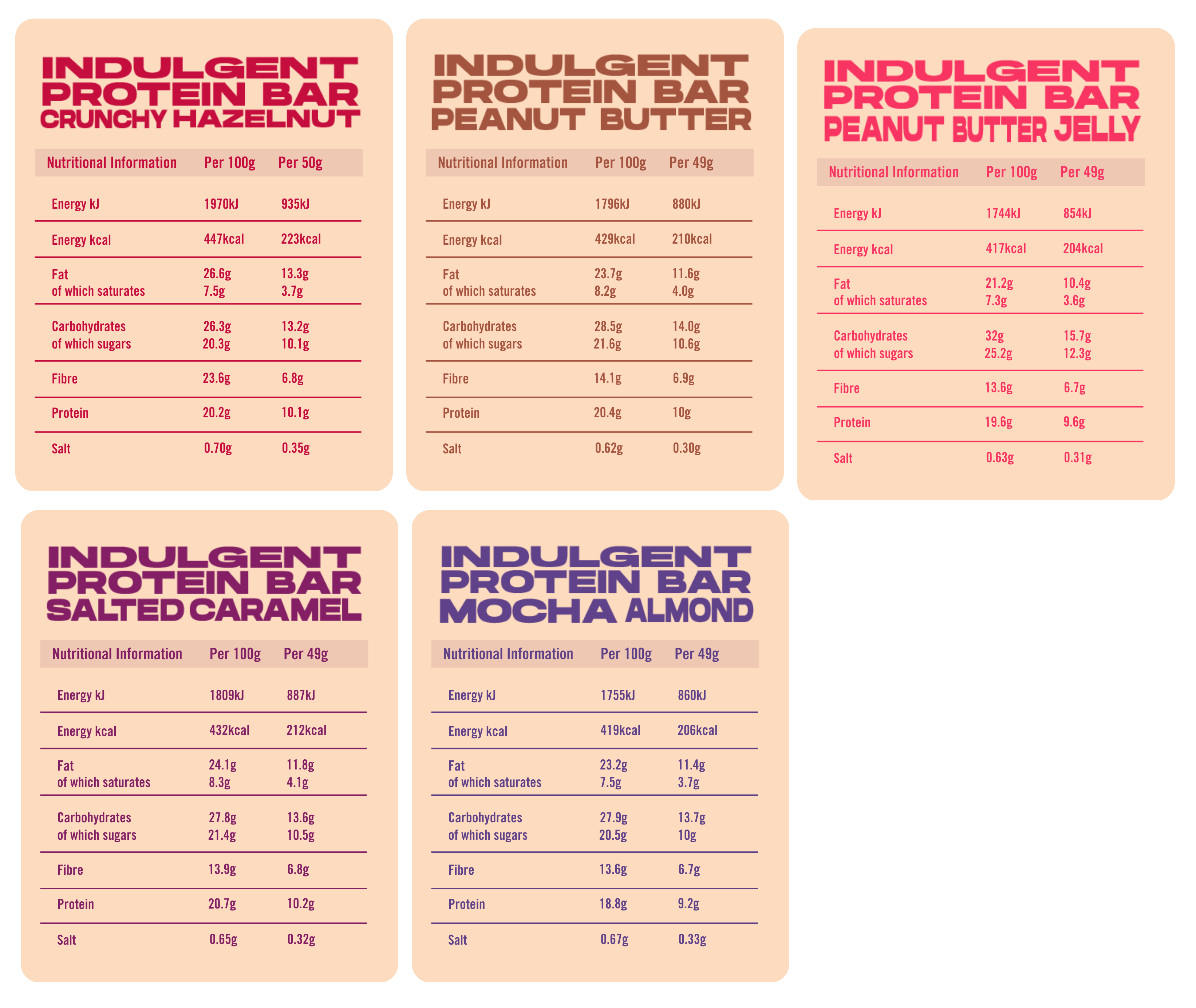 Peanut Butter Jelly - PEANUTS* (25%), Dates, 74% Dark Chocolate (Cocoa Mass, Cane Sugar, Cocoa Butter, Vanilla Powder), Chicory Fibre, Pea Protein, Protein Crisp (Pea Protein, Rice Flour), Rice Syrup, Concentrated Grape Juice, Sour Cherries (3%) (Cherries, Sugar, Sunflower Oil), Goji Berries (3%), Coconut Oil, Cranberries (2%) (Sugar, Cranberries, Sunflower Oil), Rice Protein, Freeze Dried Raspberries (1%), Emulsifier: Sunflower Lecithin, Salt, Natural Flavouring.